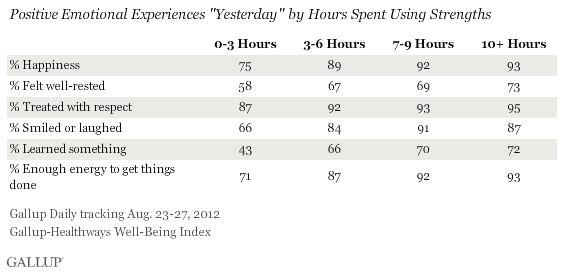 Americans also gain a boost in positive emotions the more they use their strengths. The more hours per day adults believe they use their strengths, the more likely they are to report having ample energy, feeling well-rested, being happy, smiling or laughing a lot, learning something interesting, and being treated with respect.